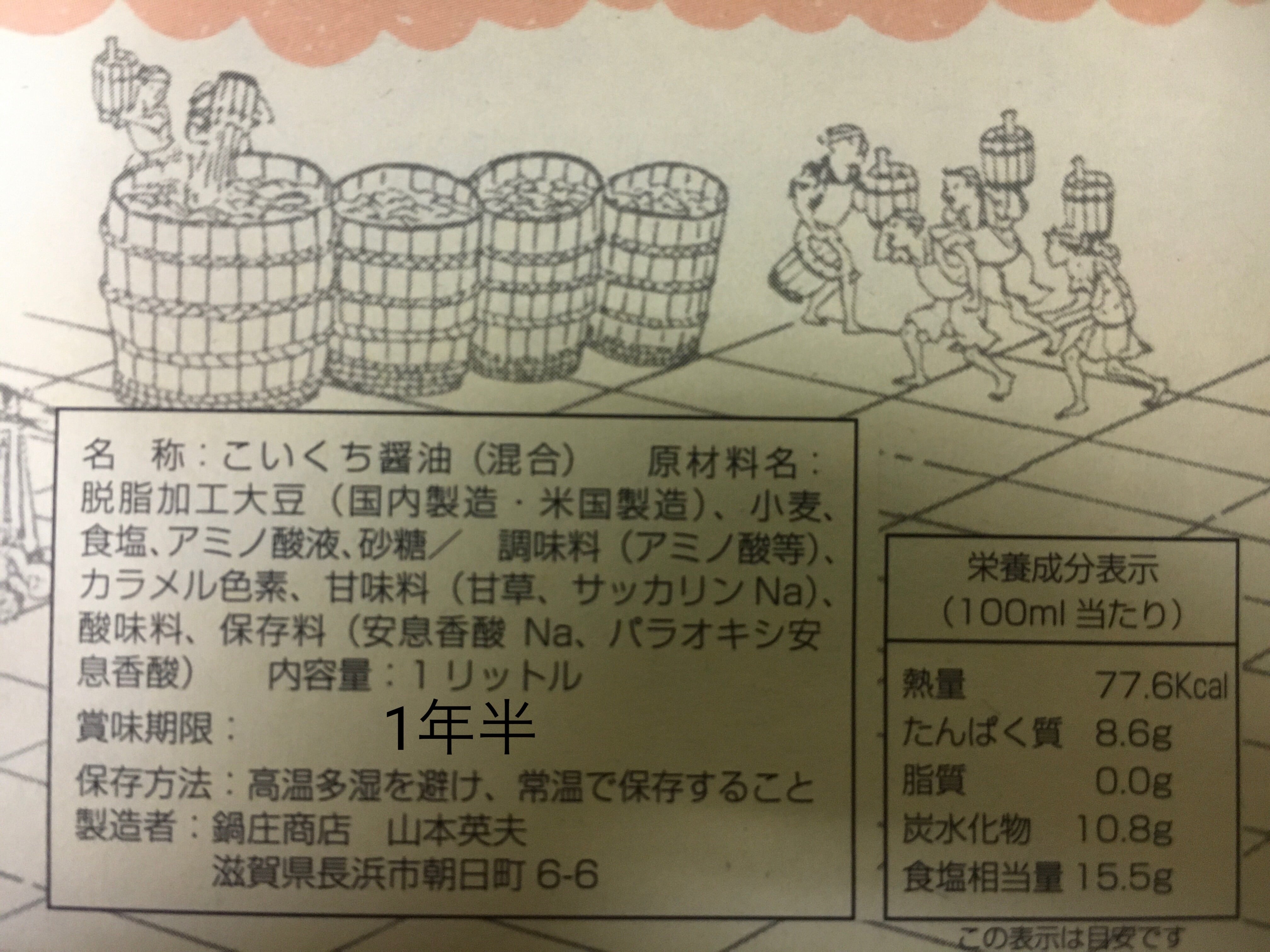 名称:こいくち醤油(混合)原材料名:脱脂加工大豆(国内製造・米国製造)、小麦食塩、アミノ酸液、砂糖/調味料(アミノ酸等)、カラメル色素、甘味料(甘草、サッカリンNa)、酸味料、保存料(安息香酸 Na、パラオキシ安